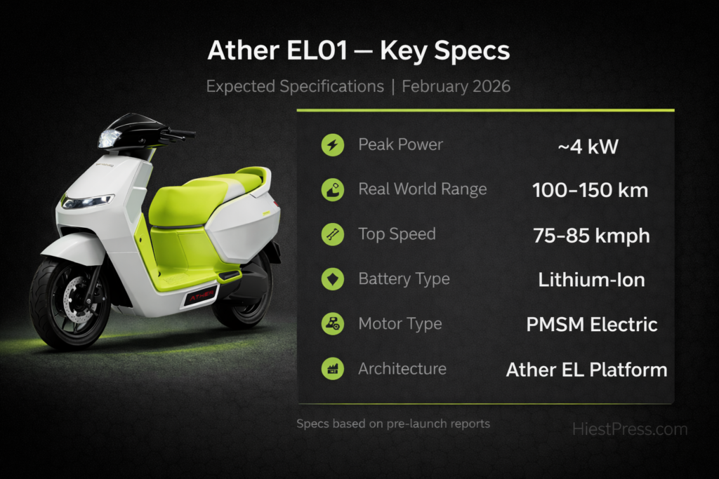 The EL01 is expected to be priced at ₹99,000–₹1.05 lakh (ex-showroom). Ather has indicated they are unlikely to go below ₹1 lakh. On-road pricing in cities like Delhi is expected to be around ₹1.10–1.20 lakh for the base variant.